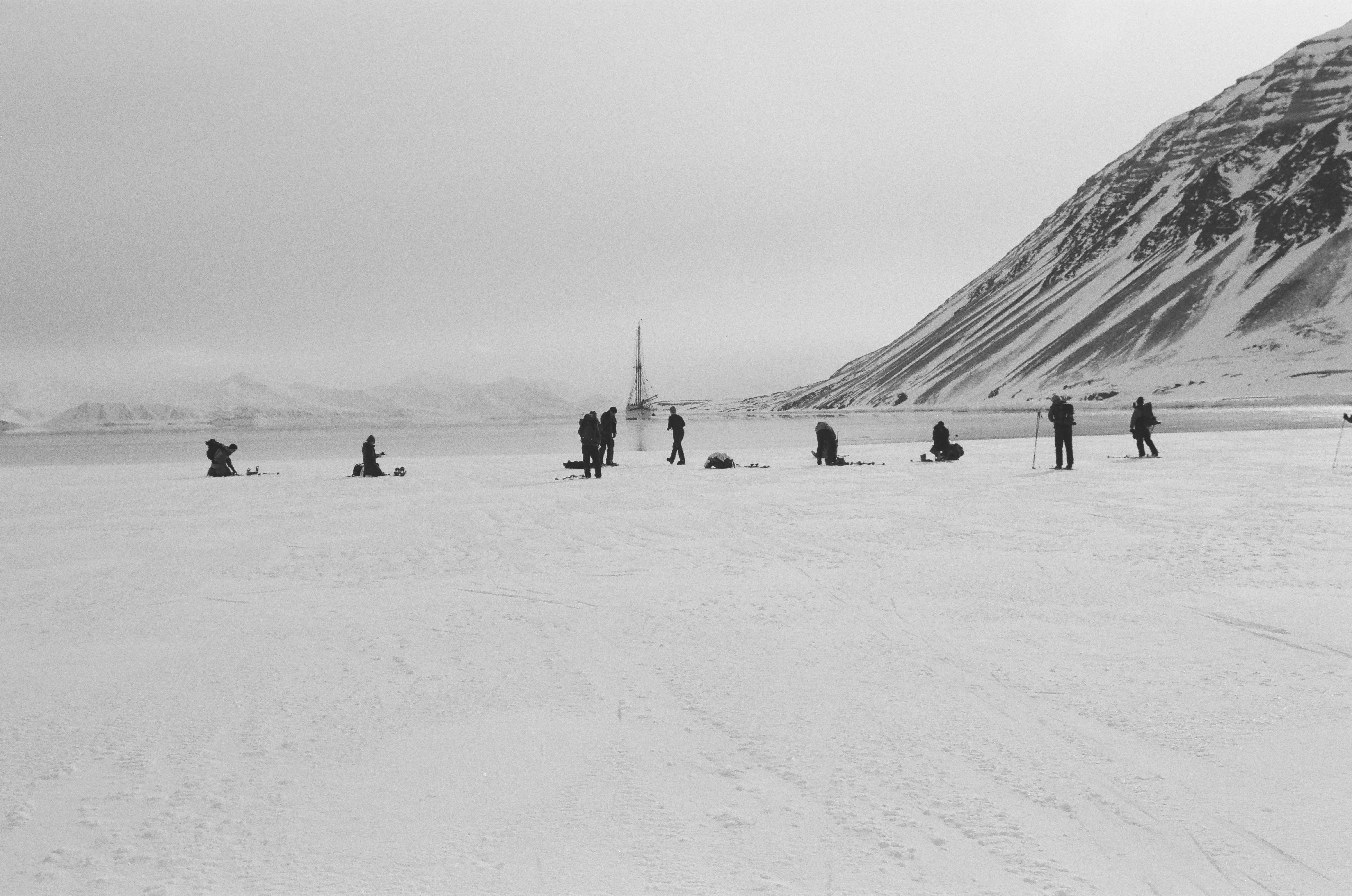 Three days later Jordan gave a hearty “Land Ho!” at the site of peaks to our east. We threaded a maze of icebergs, and hooted our way through fog to enter Isfjorden, taking refuge in a small bay near the entrance. No sooner had we dropped anchor than Siggy slipped his .308 into his pack for a seal hunt. I begged to come with. We lowered the charcoal Zodiac into the sea ice, all the while scanning the black water for movement. As I descended Siggy affirmed that we both had knives for skinning seals should it come to that.