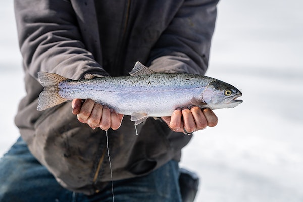 “We got it on the ice and my son was so excited. He wanted to keep it, and while normally I would have let a big fish like that go, I let him take it home. When we got home and I went to filet it, I noticed there was something in its stomach. Sure enough, there was a full 12-inch rainbow trout with the lure in its mouth,” he says.