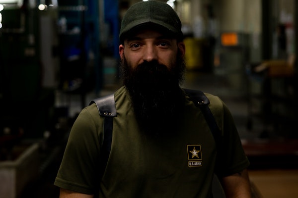 After his service in the military and work as private security, where he always carried a Buck, Mann got an opportunity to work for the company. He started on night shifts in prep, the fabrication department. A year later he was certified to run almost every machine, including all of the grinders, on the floor. This allowed Mann to become a trainer and move to the day shift, where he was a lead for the next two years.