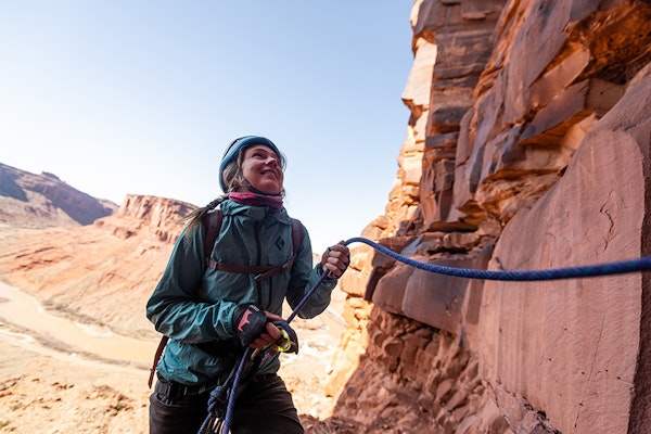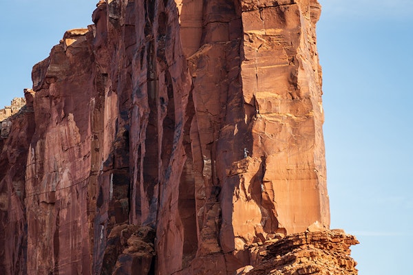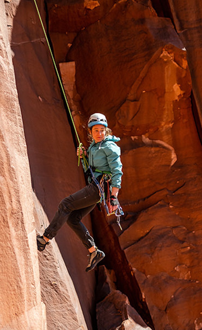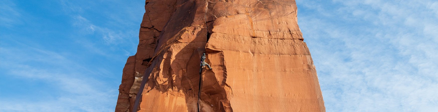 Our plan had been to do a whole tour of Utah tower climbs, a bit of a mental game since some of the towers look like they’re barely standing, but the weather had other plans for us. Having climbed the Fisher Towers – including the mega classic “Ancient Art,” on our last trip, we decided to try something different. We managed to squeeze in the Lighthouse Tower, a three-pitch squeeze chimney with an exposed stem box section that gives way to endless views of the Colorado River from the top. Once again, we somehow had the tower to ourselves.