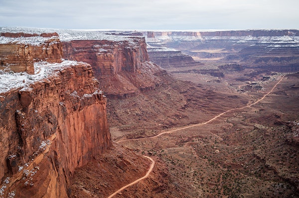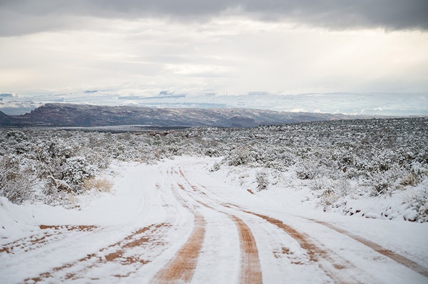 We pulled into Moab in the early evening, in a snowstorm. By morning, more snow had accumulated than we’d seen in Montana in weeks. Looking out to the La Sal Mountains we briefly regretted not bringing our ski gear. In the desert, you have to wait a solid two days, sometimes longer, after a precipitation event for the sandstone to dry, otherwise you risk damaging the rock or your gear failing.