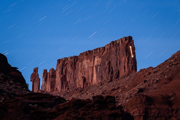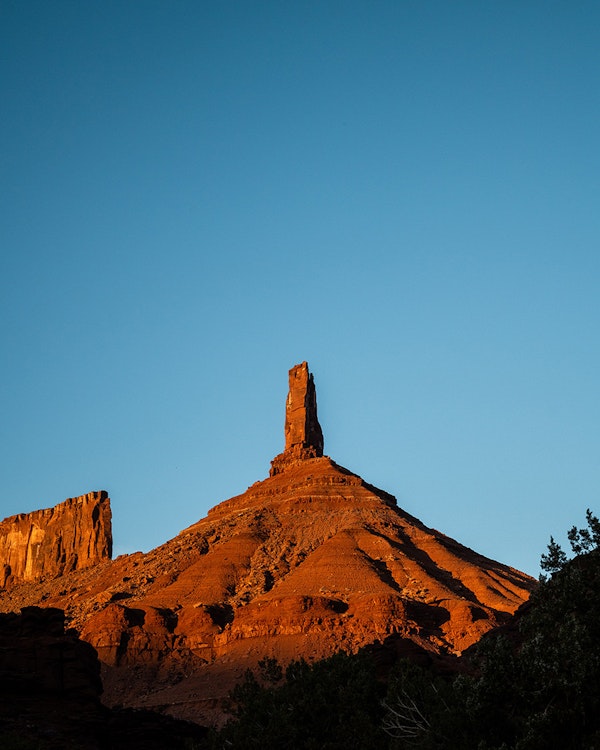 The next morning, we woke up early to a cloudless sky filled with stars, finished off our coffee, and started up toward the towers. After about an hour of hiking, we made it to the saddle between Castleton and the Rectory, which were likely at one point part of the same formation and have since been separated with a sizable gap by millennia of erosion. With the saddle to ourselves, which is almost unheard of, we watched the sun slowly cast its warmth across the southern face of the Rectory, letting the cold rock warm before racking up and starting up the route. After several hours of beautiful splitter crack climbing, we made it to the summit and looked back toward Castleton Tower.
