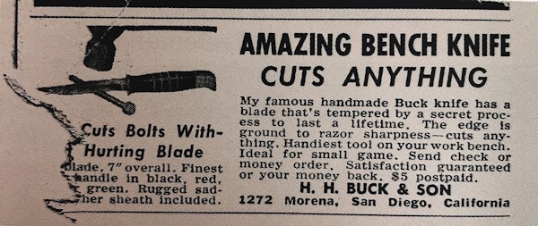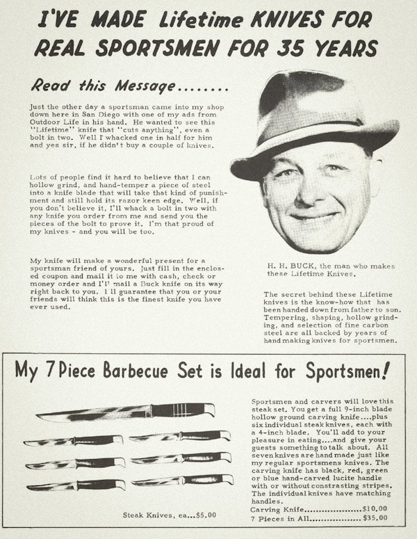 Even so, the good days were often outnumbered by the bad. At one point, the Buck’s (who had begun to run small ads in national outdoor magazines) fell so far in arrears in payment to advertising consultant Bill Phillips that he refused to place any more ads until he was paid.