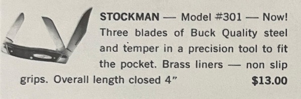 Although overshadowed by the dramatic success of the Folding Hunter, Buck’s entry into the basic pocket knife market was a second important factor in the growth of the ‘60s.