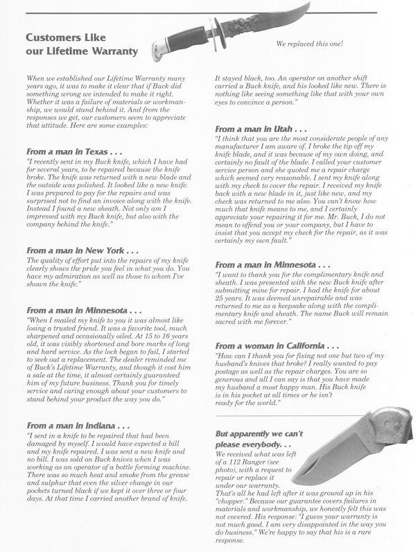 "We kept trying to find a silver lining in all those dark clouds, but things seemed to go from bad to worse," Buck recalled. "It was more than a simple downturn in our sales. America's economy had gone so soft that hundreds of our dealers had gone out of business. Those still in business had knives sitting on their shelves; they were not about to build their inventories.